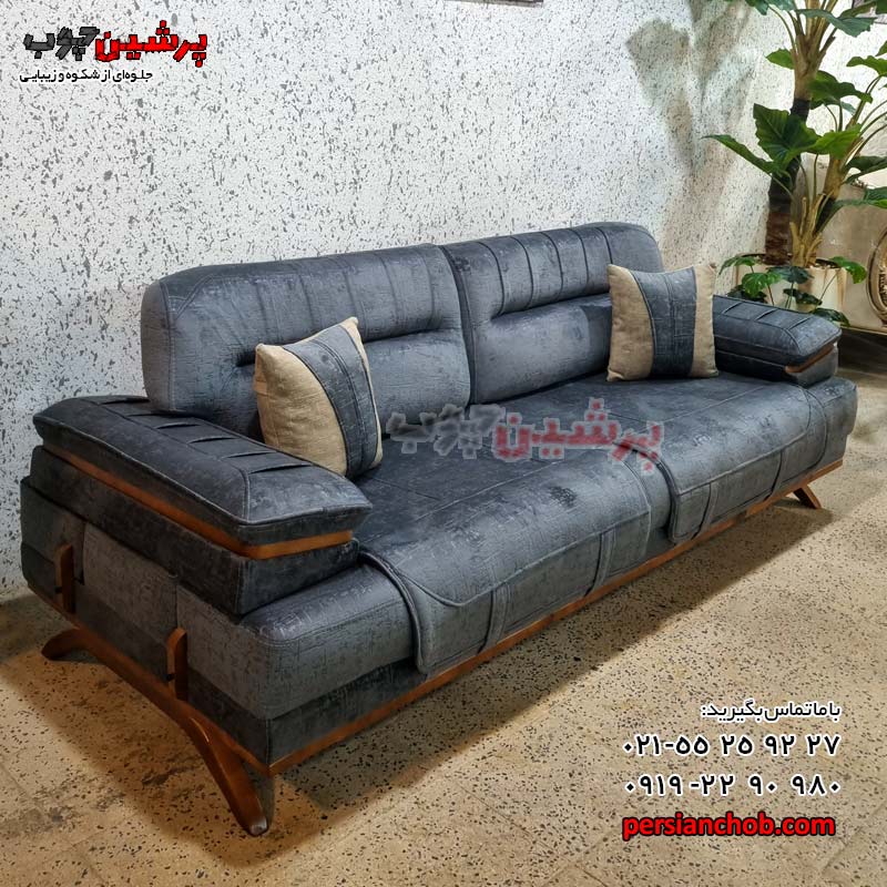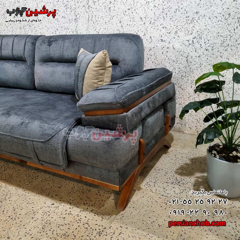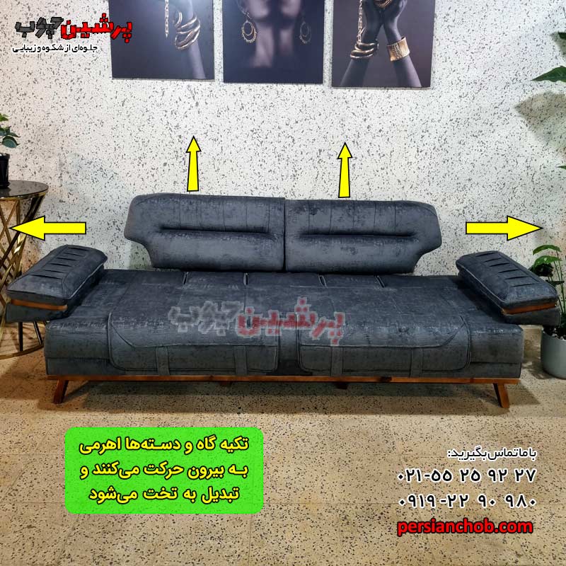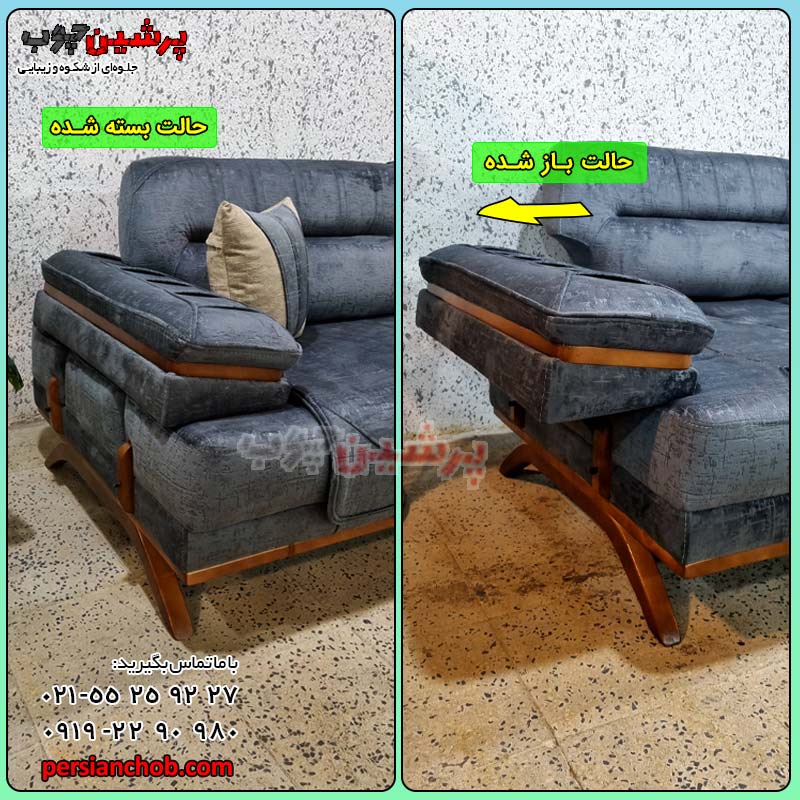 • تکیه گاه و دسته‌های کاناپه‌ها به صورت اهرمی یه بیرون می‌رود و حالت تخت می‌شود.